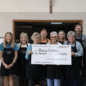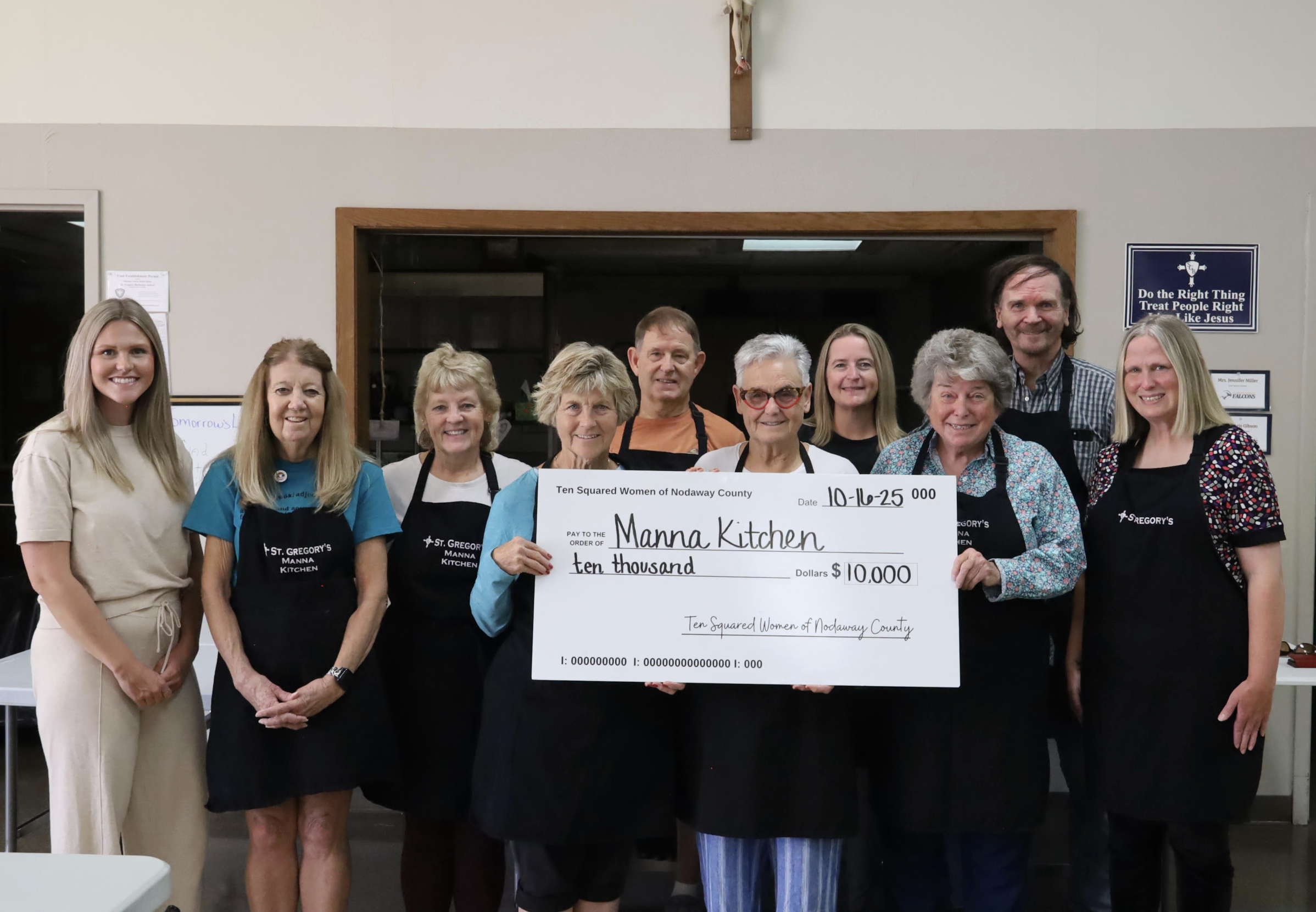 For the last quarter of the year, 10 Squared Women presented Manna Kitchen with a $10,000 donation. At the presentation was front: 10 Squared Women representative Amanda Twaddle, Manna Kitchen volunteers Cindy Roach, Janet Smith, Kim Talmadge, Monica Mauzey, Janice Falcone, Nicole Falcone; back: Les Smith, St. Gregory Church Secretary Devin Reed and Jim Eiswert. Not pictured is Fr. Albert Bruecken, OSB.