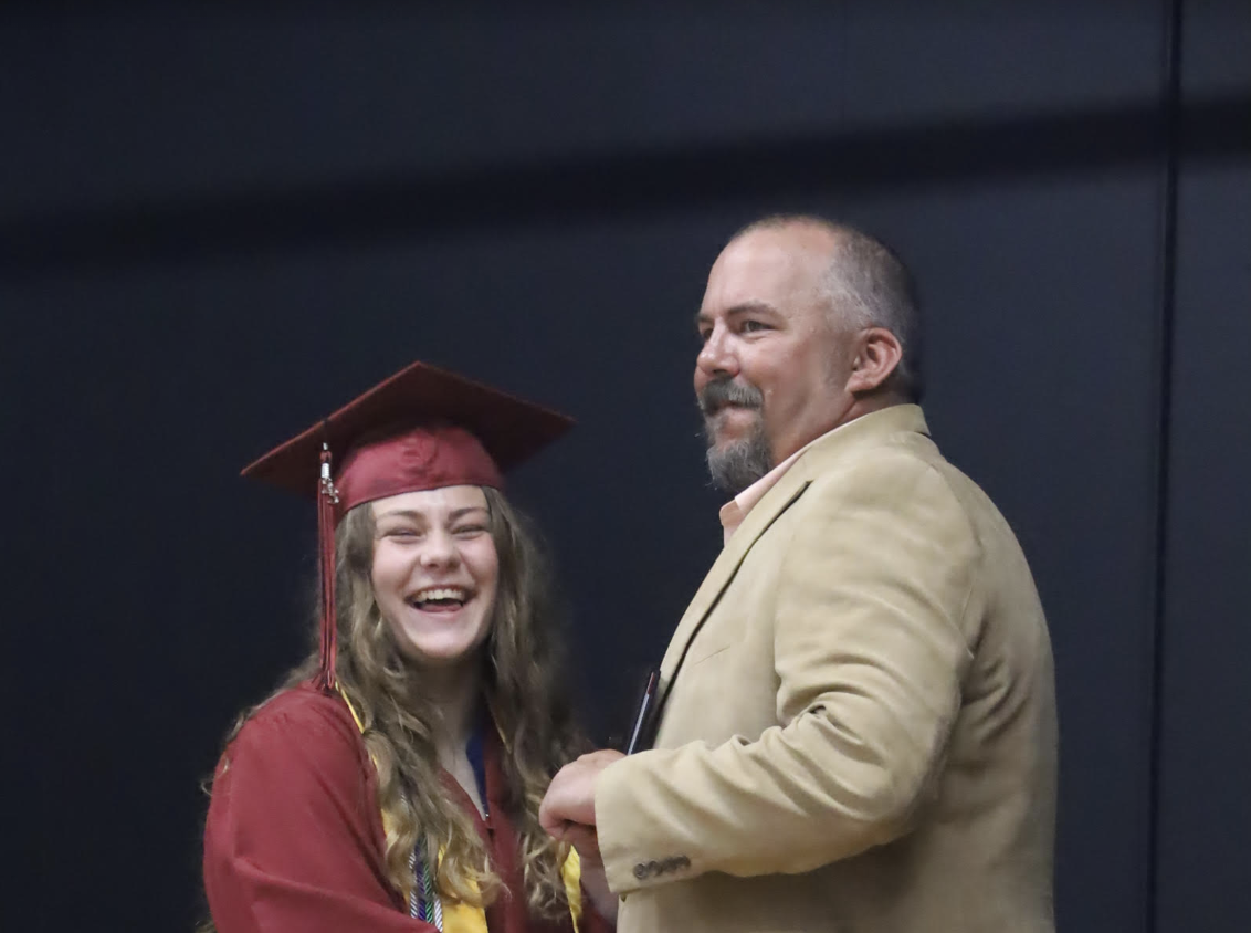 Two happy people express their delight during the May 14 South Nodaway Class of 2023 graduation ceremony. Madelyn Swinford receives her diploma from her father, Pat Swinford, a SN board member. See graduation photos on Page 2 of this week’s paper.