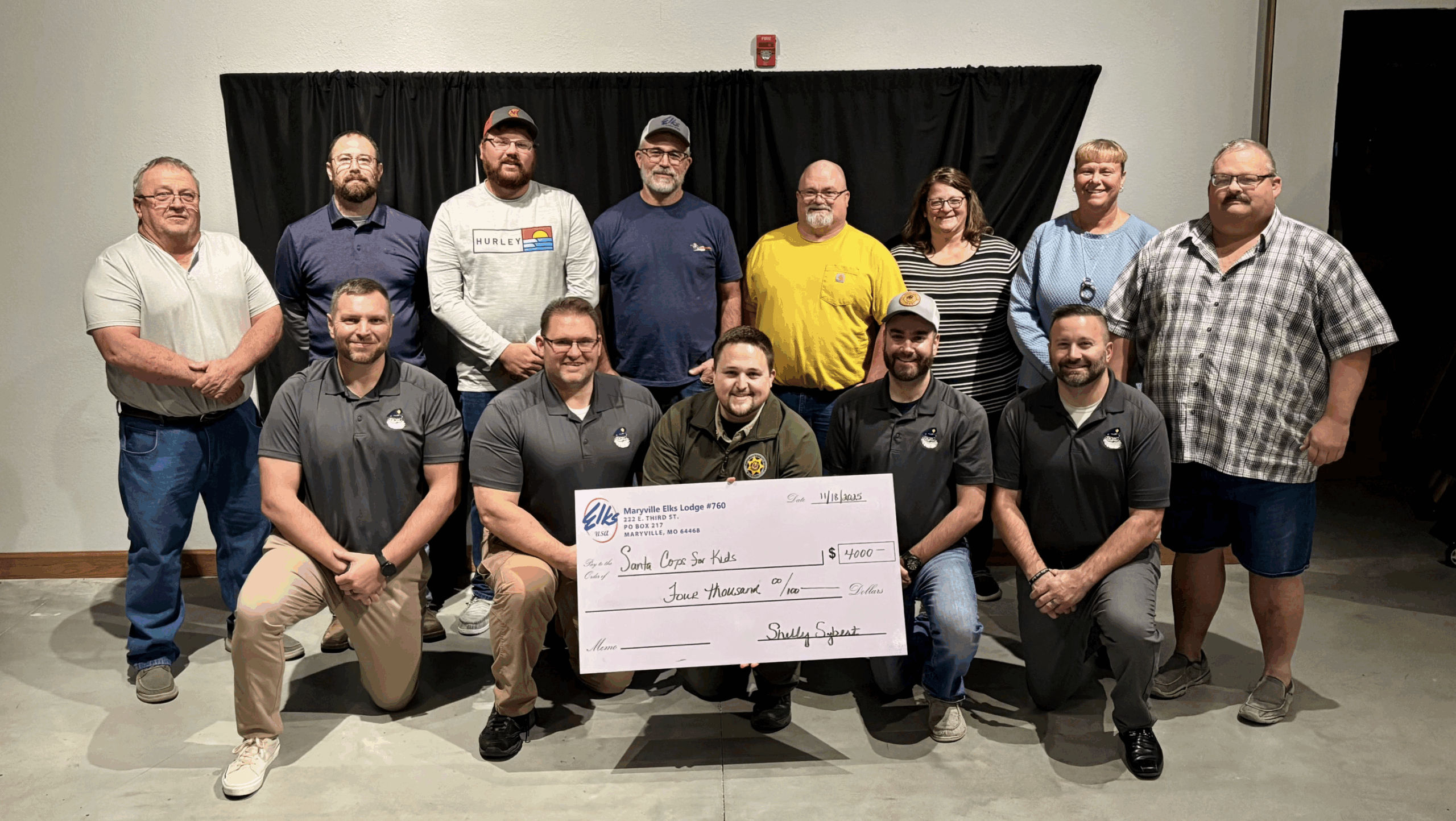 The Benevolent and Protective Order of Elks 760, Maryville, recently donated $4,000 to Santa Cops for Kids. At the presentation were front: Kyle Hoyt, Northwest University Police; Ryan Spire, Maryville Treatment Center; Shadoe Miller, Nodaway County Sheriff’s Department; Jeremy Staples, Maryville Public Safety; Ian Myers, Maryville Public Safety; back: Elks officers Steve Day, Tim Eckstein, Brandon Newton, James Beemer, James Richardson, Shelly Sybert, Tammy Thompson and Kirby Sybert.