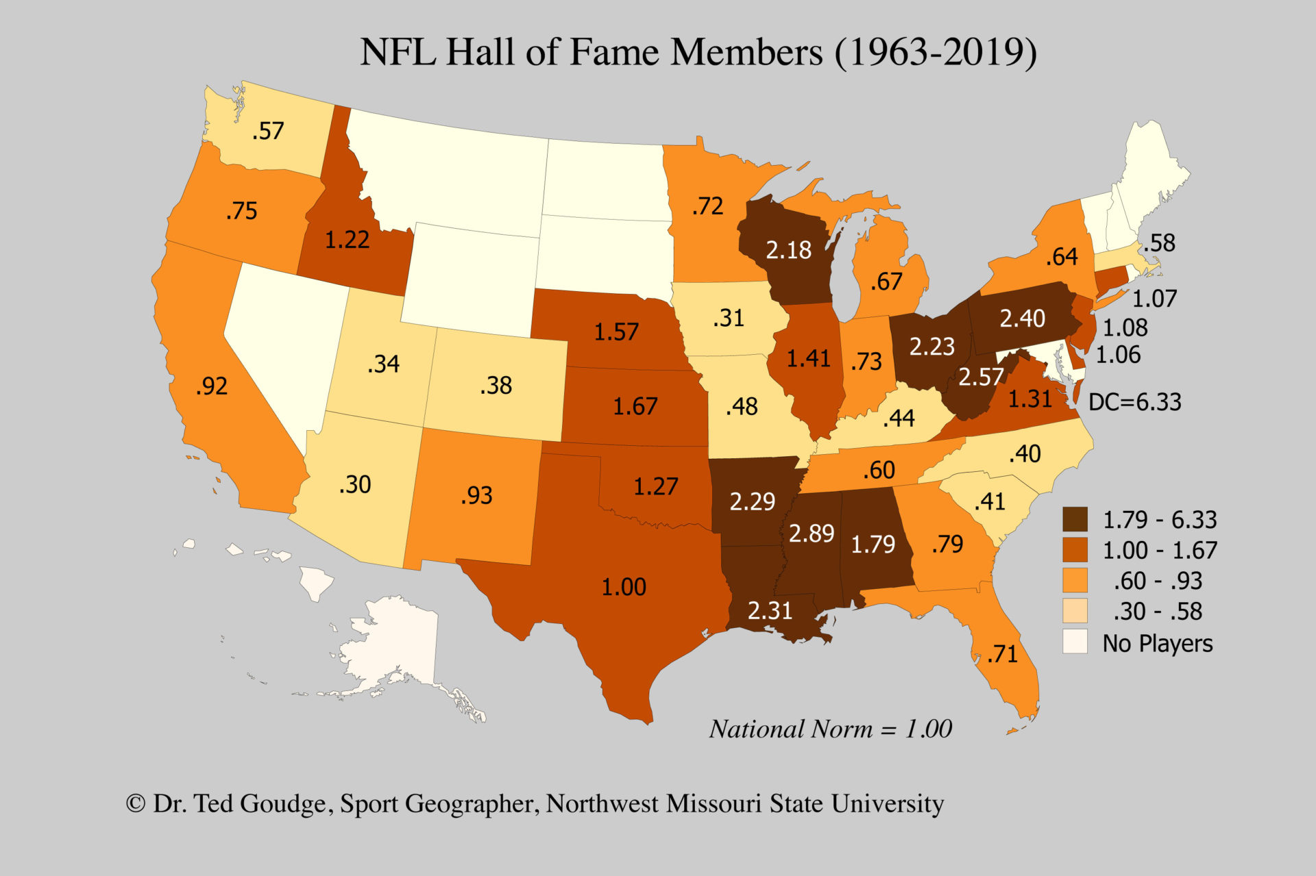This per capita map, based on where the Hall of Famers went to high school, indicates two regions of dominance. These areas are Pen-WeV-Oh (Pennsylvania, West Virginia & Ohio), or the early ‘core’ of pro football, and the Southern states led by Mississippi, Arkansas and Louisiana.