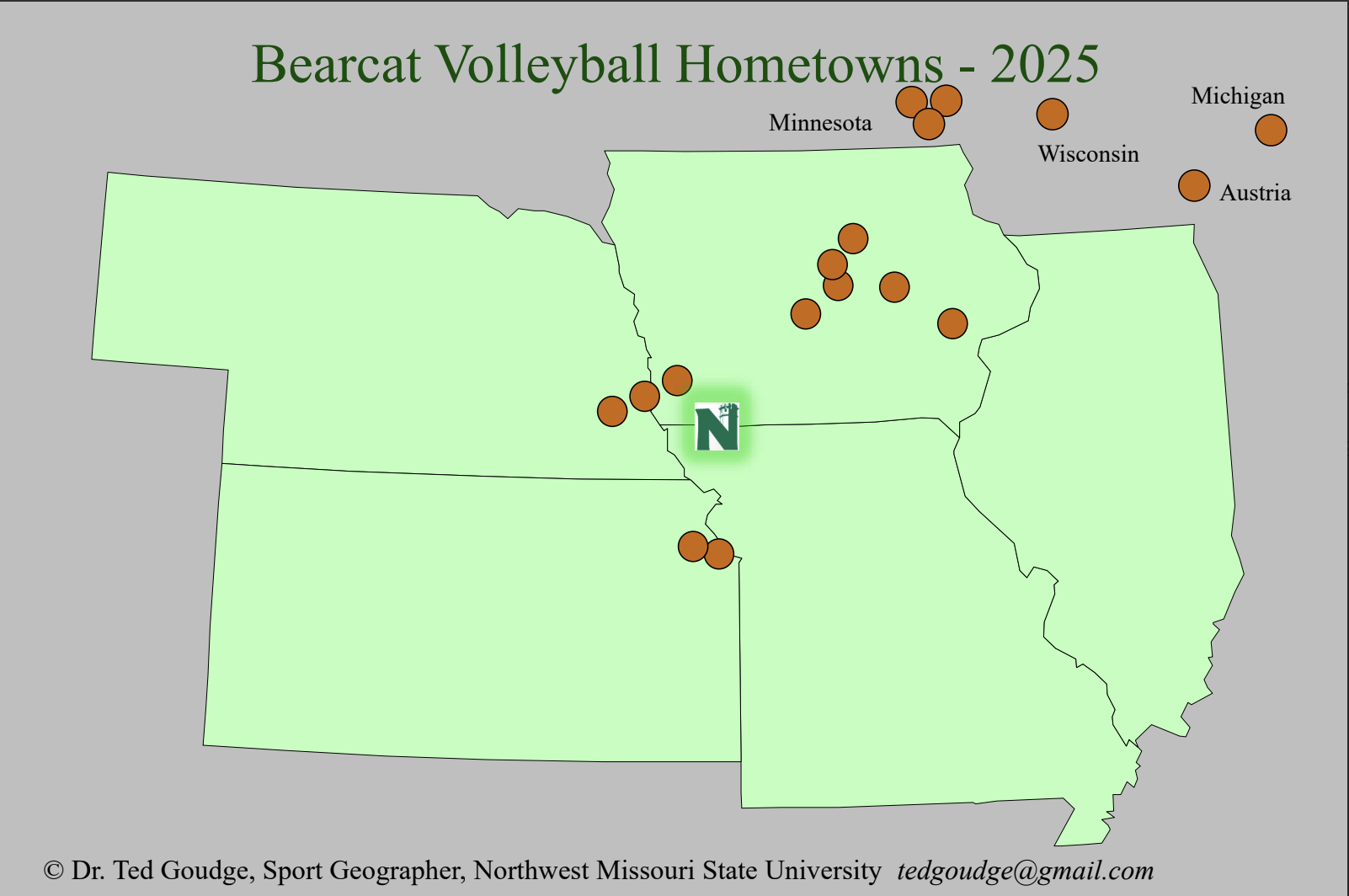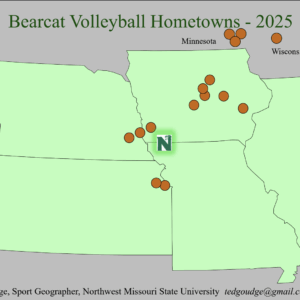 Now that Fall Sports are in full-swing, we can devote some attention to women’s volleyball. Northwest Missouri is currently sporting a 6-3 overall record and set to begin conference play. This map displays the hometowns of the seventeen players on the Bearcat Volleyball team. The roster has seven from Iowa, three from Minnesota, two from Nebraska & Kansas and one each from Austria, Michigan and Wisconsin. This geographic breakdown skews to the northern portion of where Northwest’s general student body population calls home. Go Bearcats!