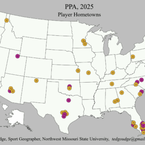 The PPA (Professional Pickleball Association) Tour is the traditional, bracket-style tour format that determines the best pickleball players in the world. This map displays the top ranked men’s (31) and women’s (23) players that live in the United States. Florida is the state with the most players (13) followed by California and Texas with 6 each, Arizona and North Carolina with 3 each. Pickleball players tend to be distributed throughout the country. Pickleball has been the fastest growing sport in the U.S. for the past five years.