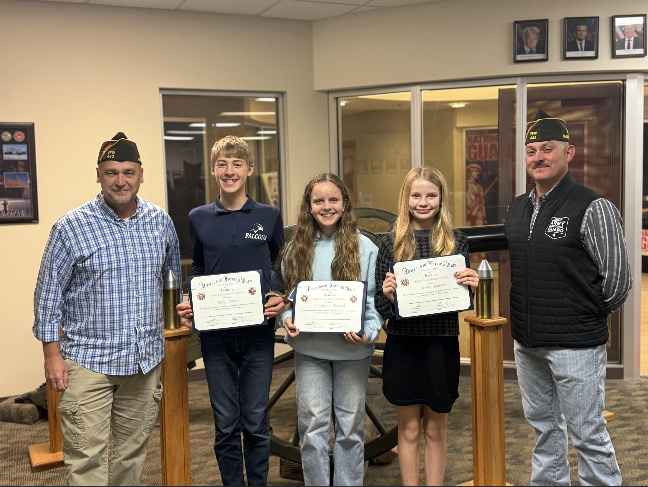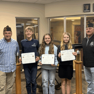 The Seth Ray David VFW Post 442, Maryville, announced the finalists in the 2025 Patriot’s Pen youth essay contest. Jeremy Cobb, VFW representative; Kody Gockel, third place; Vilhelmina Chloupek, second place; Brielle Budden, first place; and Aaron Brown, VFW representative, were at the presentation.
