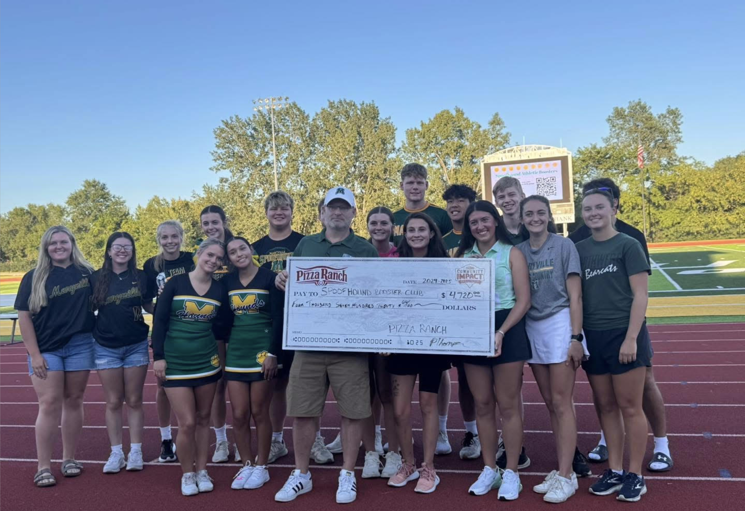 A community pep rally was held on August 21 at the Hound Pound so fans could meet the various teams competing this fall. Maryville Pizza Ranch General Manager Paul Thompson was joined by two seniors from the teams as he presented a $4,720 check to the Maryville Booster Club.