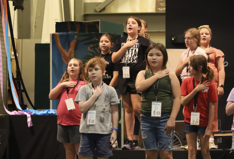 The Olaf cast of “Frozen Jr.” does a walk-through of a musical number during rehearsals for the performances Friday through Sunday, July 21-23. Some of the cast members are Madi Wood, Henry O’Gwin, Hannah Steffen, Pippa O’Gwin, Marleigh Weichinger, Penny Cochenour, Gracelyn Wood and Alanah Devers.