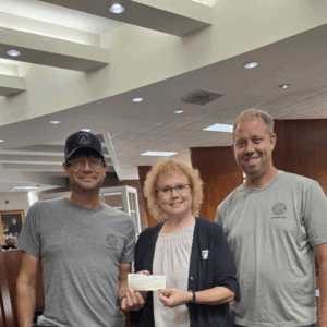 Danielle Miller, trustee of the Gladys M. Rickard Charitable Trust, presents a check to Tim Guilliatt and Bo Hansen, board members of the Hopkins Fire Protection District for $75,000 to go towards the purchase of new turnout gear and additional PPE for the volunteer members of the department. The awarded grant funds are being paired with additional funding that comes from multiple fundraising events hosted by members of the fire department, allowing all firefighters to be equipped with new, proper fitting gear.