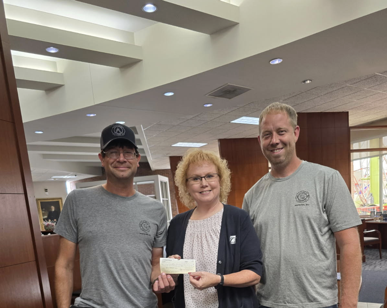 Danielle Miller, trustee of the Gladys M. Rickard Charitable Trust, presents a check to Tim Guilliatt and Bo Hansen, board members of the Hopkins Fire Protection District for $75,000 to go towards the purchase of new turnout gear and additional PPE for the volunteer members of the department. The awarded grant funds are being paired with additional funding that comes from multiple fundraising events hosted by members of the fire department, allowing all firefighters to be equipped with new, proper fitting gear.