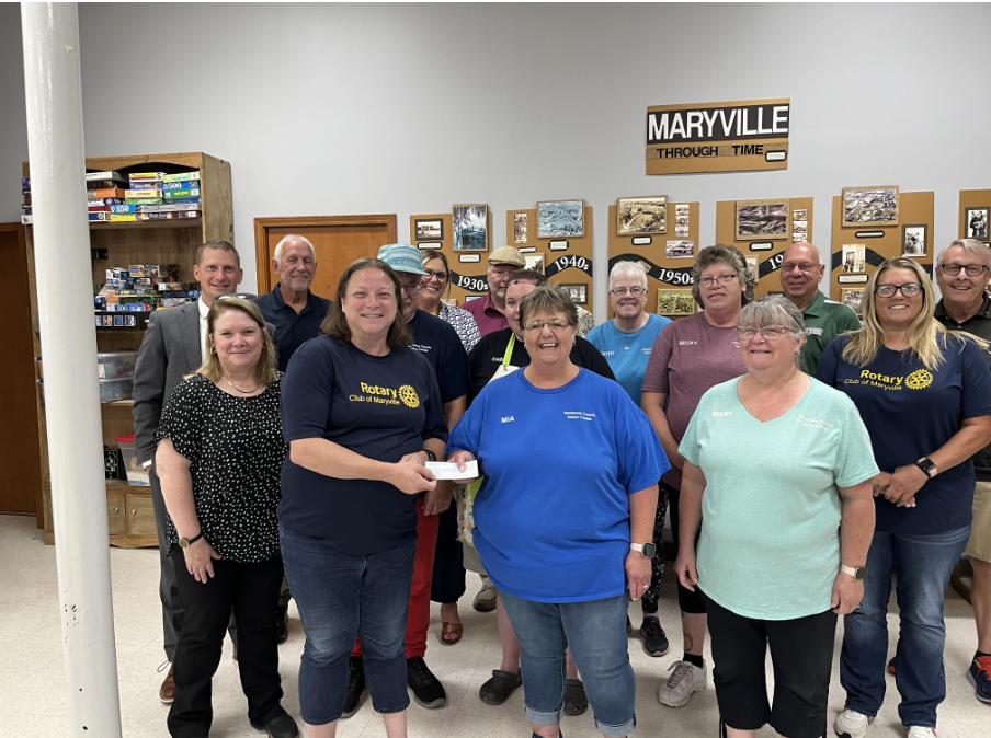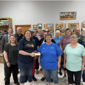 The Maryville Rotary Club, led by Skye Pournazari, president, presented $1,000 to the Nodaway County Senior Center Administrator Mia Nelson recently. They are flanked by other Rotarians and the center’s staff for the annual gift presentation.