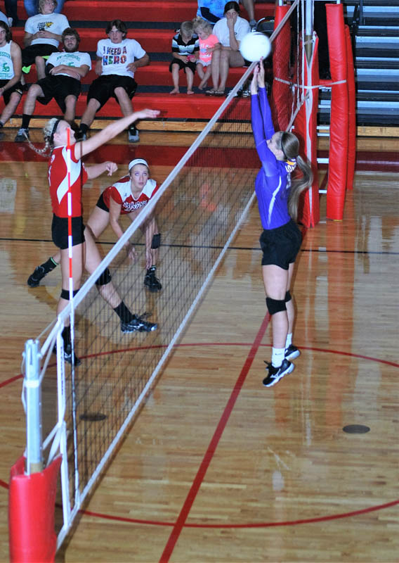 The Trojan varsity team lost to Mound City in two sets, 22-25 and 18-25. Stats: Sam Keith, four kills Rachel Farmer, five assists and three aces Breanna Day, two blocks Amanda Bohannon, six digs Nodaway-Holt sophomore Amanda Bohannon passes to the front row during the September 15 conference match. Trojan senior Macie Bohannon goes for the kill.